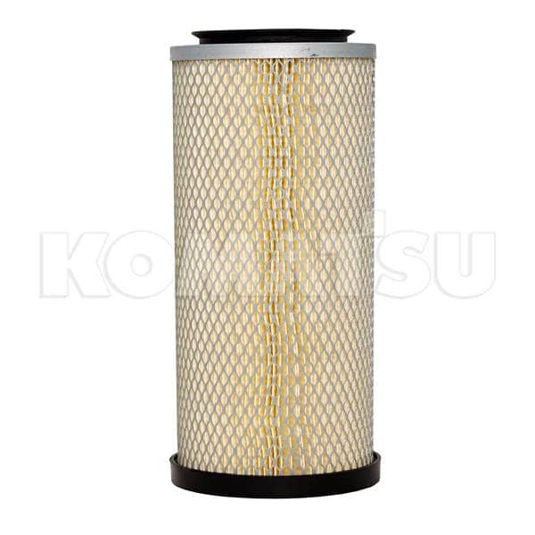 Cylindrical Air Filter with diamond-patterned metal mesh exterior and pleated interior. Bordered by black rims. Suitable for various Komatsu machinery.