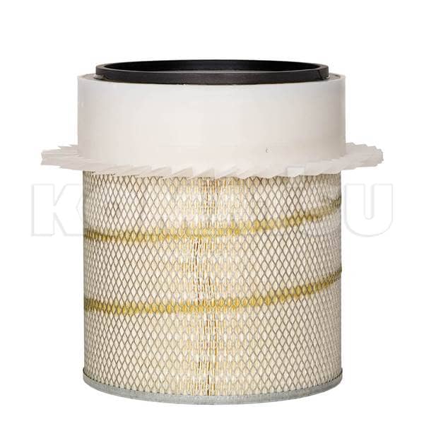 Cylindrical Air Filter with pleated paper element and metal mesh support. Designed for various applications to remove particulates from the air. Features a black rubber sealing ring for secure installation. Fits Komatsu machines.