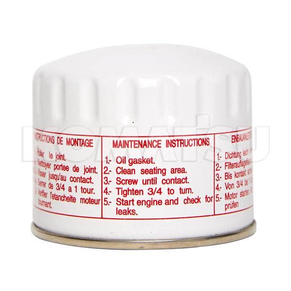 White cylindrical hydraulic filter with metal base. Features maintenance instructions in three languages. Designed for high-pressure and temperature circuits. Weight: 0.3915 kg.