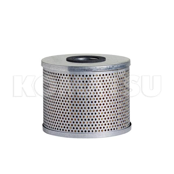 Cylindrical metal lube filter with perforated outer surface. Dimensions: 13.0 x 13.9 x 10.7 cm. Ensures optimum performance and life for Komatsu machines.