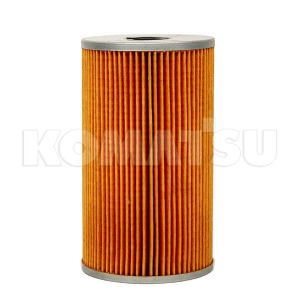 Lube Filter with pleated orange material and metal ends. Designed for Komatsu machinery to clean fluids such as oil. Weighs 0.0173 kg.