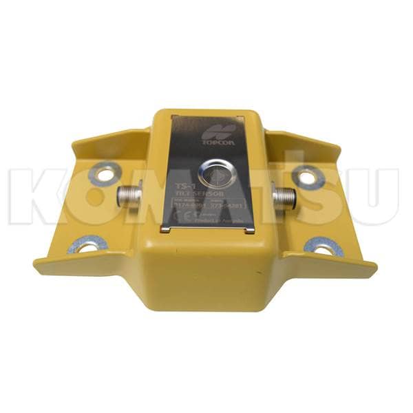 Topcon TS1 Tri Axis Tilt Sensor with yellow metal bracket and four mounting holes. Features a central silver component with circular indentation and threaded bolts. Suitable for various applications.