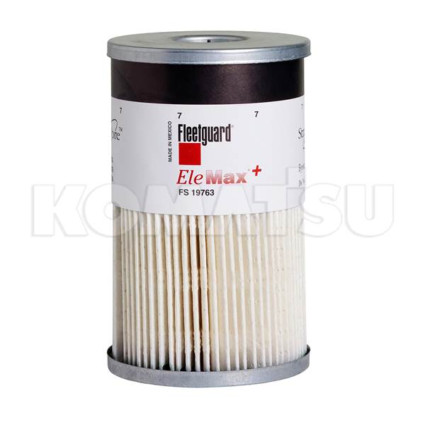 Fuel Filter Element with pleated paper element and metal top and bottom. Designed for automotive or industrial applications. Fits Komatsu model WA1200-6 and potentially other models.