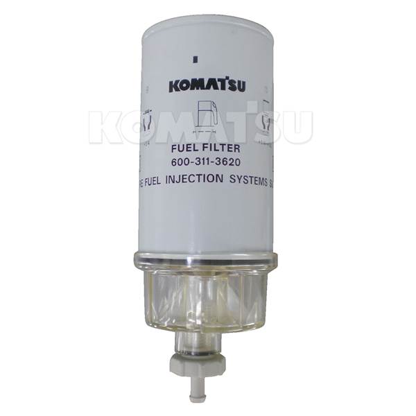 Fuel Pre-Filter Cartridge with dimensions 9.7 x 9.4 x 18.1 cm. Features a drain valve. Fits Komatsu models WA320PZ-6, D65EX-15E0, D65PX-15E0, WA320-6, and potentially others.