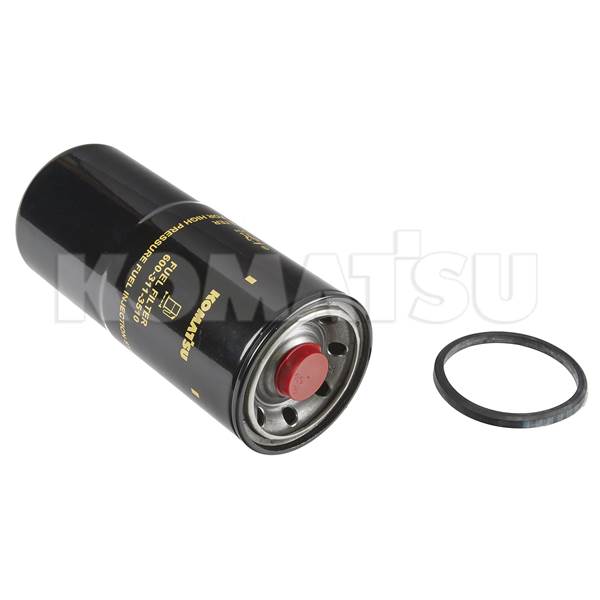 Fuel Filter Cartridge with dimensions 14.0 x 34.0 x 14.0 cm. Includes black rubber O-ring gasket. Fits Komatsu models D65EX-15, D85EX-15, D65PX-15, D275AX-5.