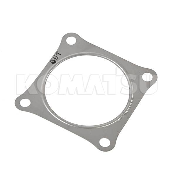 Square metal gasket with circular inner cutout and four corner holes. Dimensions 11.7 x 11.7 x 0.1 cm. Fits Komatsu WA200PZ-6, WA200-5, WA250-5, WA250PZ-5, WA320-5 models.