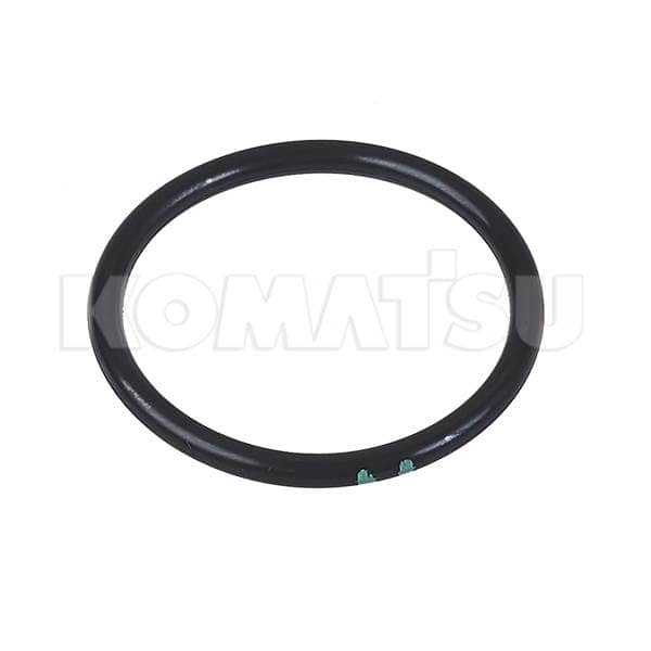 Black Rubber O-Ring with dimensions 4.5 x 4.5 x 0.3 cm. Temp Range: -20 to 160°C. ID Color: 2 Green Dots. Hardness: JIS HS 90 ± 5. Material: FKM-1E. Suits various Komatsu machines.
