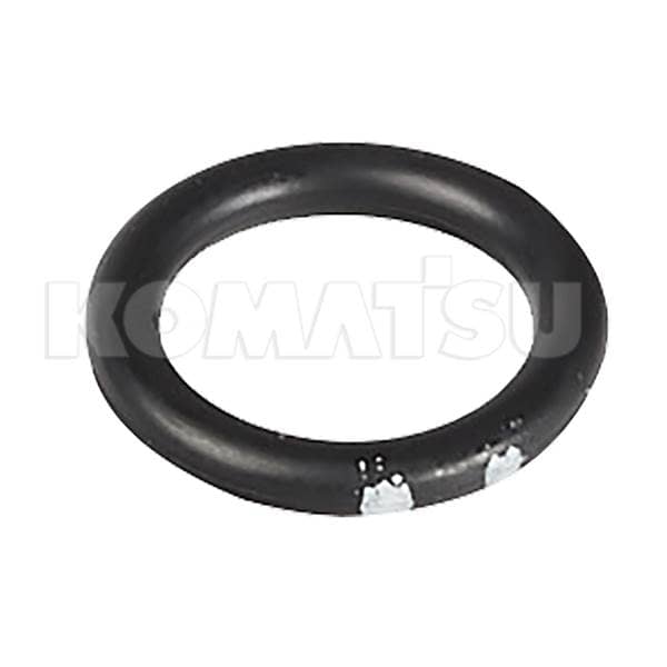 Black Rubber O-Ring with dimensions 10.8 x 9.9 x 1.1 cm. Temp Range: -30 to 110°C. Hardness: JIS HS 90 ± 5. Fits various Komatsu machines.