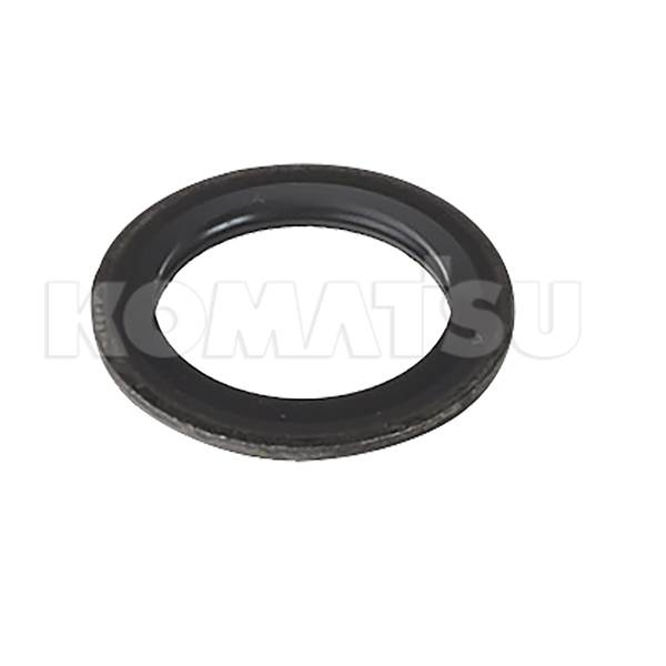 Circular rubber seal washer with a flat, smooth surface. Black in color with a slightly raised inner edge. Suitable for machinery or automotive applications to provide a tight seal between components.