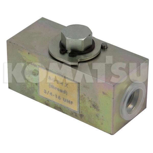 Hydraulic Valve Assembly with dimensions 4.0 x 9.0 x 4.0 cm. Features a 3/4-16 UNF threaded port and hexagonal adjustment knob. Suits various Komatsu Excavators.