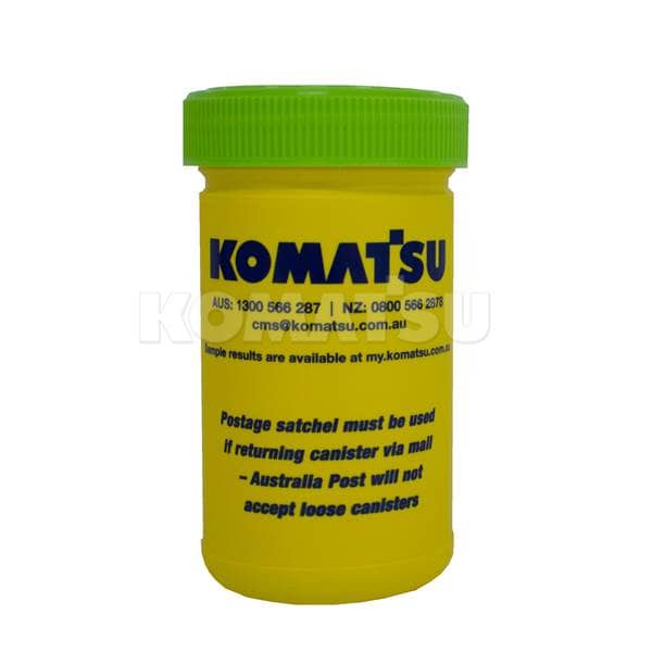 Yellow plastic oil sampling canister with green screw-on lid. Includes Komatsu branding and contact information for Australia and New Zealand. For use in Komatsu oil wear analysis.